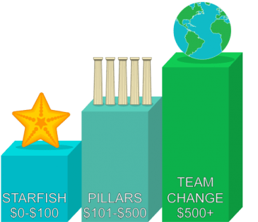 Through your donation, you become part of our team, and we want to celebrate that by recognizing you as part of our donation tiers. Our tiers are based on cumulative giving throughout the year so feel free to take advantage of our monthly giving option or provide a one time gift. Did you know that by giving $8.34 per month you can fund a project each year? Or for $42 per month you can join members in our highest tier, Team Change?